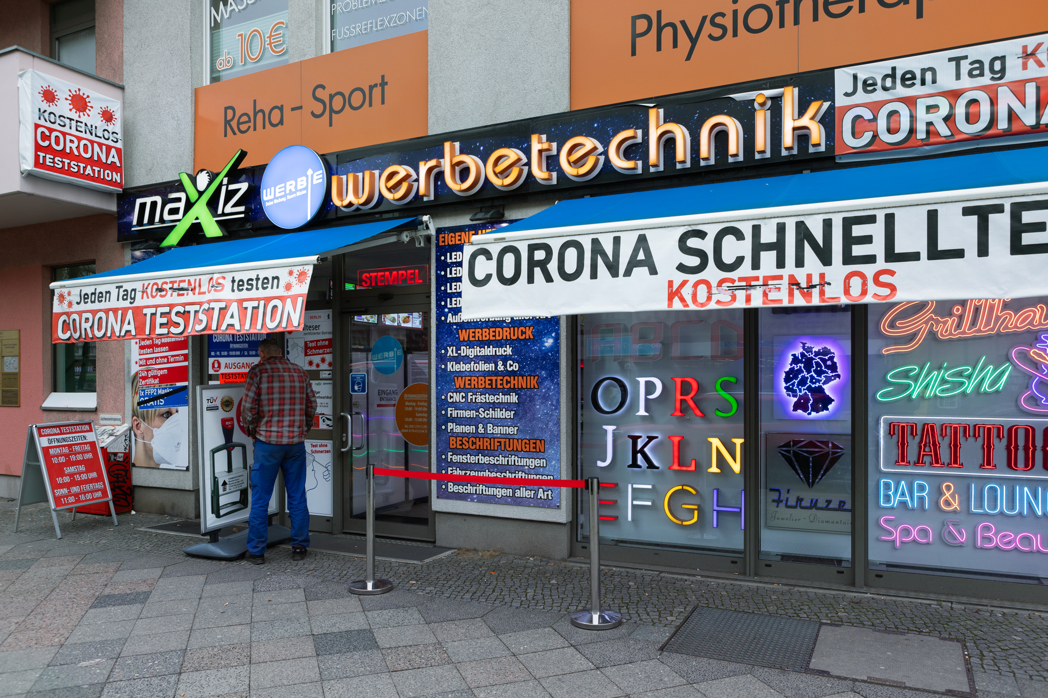 Die Aufnahmen entstanden in Berlin im Frühjahr 2022. Auf den Bildern ist eine Auswahl von Corona-Testzentren zu sehen, die ich im Bezirk Berlin-Mitte vorgefunden habe. Diese Testzentren sind Anzeiger der Umstrukturierung und Neuverteilung des öffentlichen Raums, ausgelöst durch politische Entscheidungen und den folgenden wirtschaftlichen Prozessen. Im Fokus liegen Orte, die als Testzentren eine neue Nutzung erfahren haben.